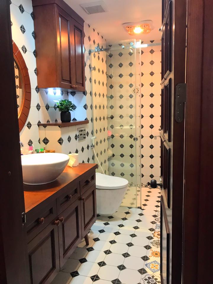 Khu bếp đầy đủ tiện nghi, lạ và đẹp mắt với tường hoa. Song song với tính thẩm mỹ, Thùy Dương còn sử dụng hệ tủ lớn để đảm bảo nhu cầu lưu trữ trong nhà.
