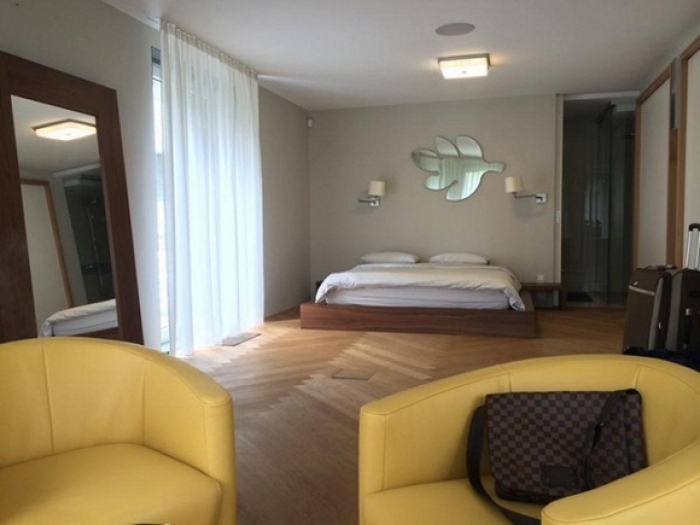Giống như phòng bếp và phòng ăn, thiết kế phòng ngủ cũng vô cùng giản đơn. Phòng có một cửa thông ra ban công bên ngoài, ngoài ra cũng có nhà vệ sinh khép kín ngay cạnh ngăn cách bằng cửa kính. Trong phòng, nội thất vô cùng giản đơn với bộ ghế sofa ngồi trò chuyện và uống trà.