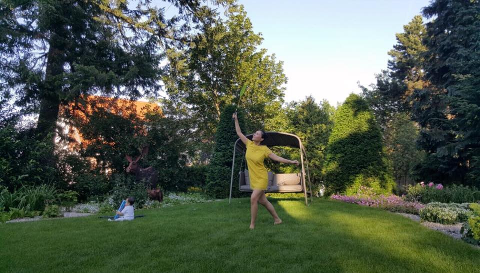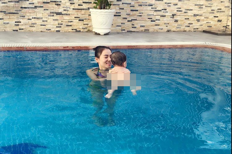Hình ảnh cô dạy bé Gấu tập bơi tại bể bơi trong nhà được nữ ca sĩ chia sẻ trên facebook của mình.