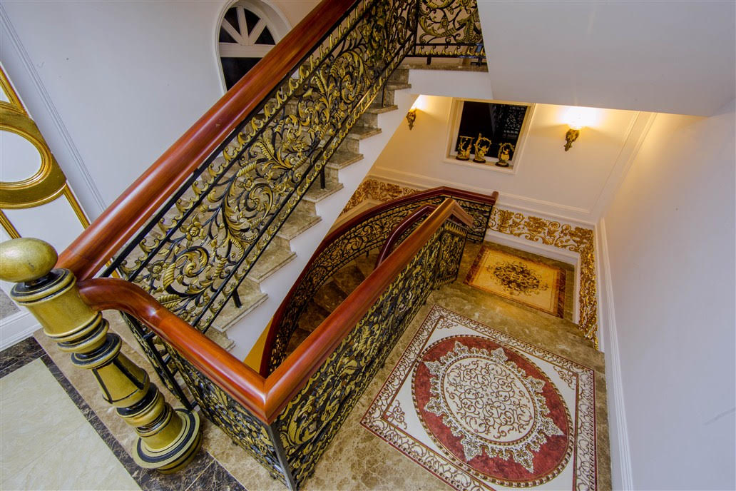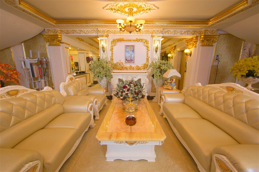 Nội thất trong từng căn phòng khiến mọi người vô cùng bất ngờ và ngưỡng mộ nhờ những chạm trổ dát vàng tinh xảo đến từng chi tiết nhỏ nhất. Những đường nét nghệ thuật tinh tế đầy cuốn hút trên tường, trên cửa, trên nội thất và trên trần nhà khiến mọi người dễ dàng liên tưởng đến hình ảnh những lâu đài châu Âu sang trọng.
