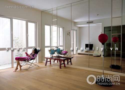 Gam màu trắng này có thể tiếp tục được nhận thấy rõ ở phòng uống trà và phòng tập thể dục. Và cũng giống như nhiều phòng khác trong nhà, hai phòng này cũng được sắp xếp rất ít đồ đạc, nếu có thì cũng trông rất nhẹ nhàng và đem lại cảm giác thư thái, dễ chịu. Phòng tập thể dục khá rộng, có lắp gương to và đặt tivi giúp cô giải trí trong lúc nghỉ ngơi. Đây là nơi Dương Đồng Thư thường xuyên tập luyện để giữ gìn vóc dáng cân đối của mình.