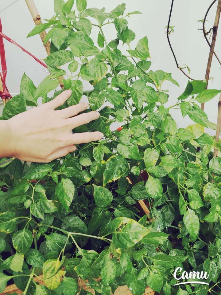 Cây ớt cũng đang ra những trái đầu tiên.