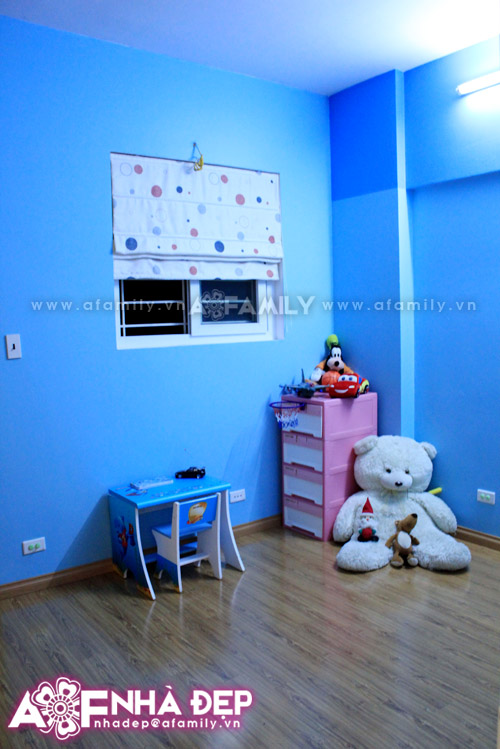 Hiện nay, cháu vẫn đang ngủ với bố mẹ, nên căn phòng nhỏ của cháu chưa được kê thêm giường vì chúng tôi muốn cháu có không gian rộng để học tập và vui chơi. Căn phòng được sơn màu xanh dương, vừa tạo cảm giác dịu mắt lại vừa phù hợp cho một cậu con trai.