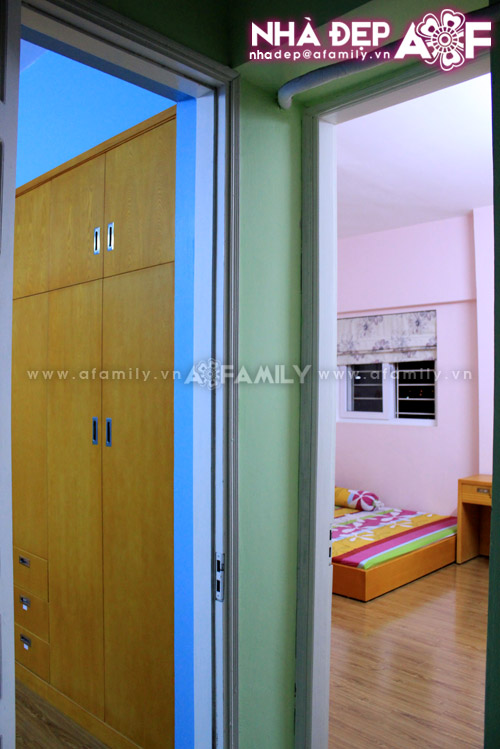 Phòng bố mẹ và con ngăn cách bằng 1 chiếc tủ lớn và đều có cửa thông ra ban công.