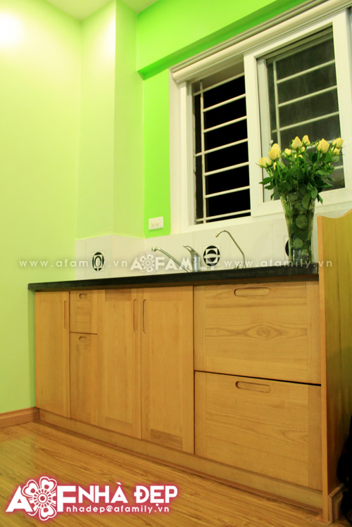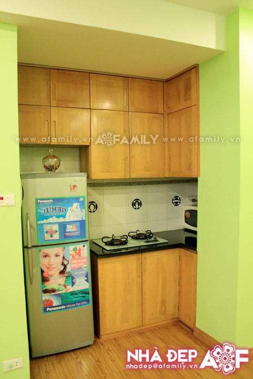 Khu vực bếp được sắp xếp gọn gàng để tận dụng tối đa không gian của căn hộ vào mục đích sử dụng. Ở đây, chúng tôi cũng chọn dùng một số viên gạch có họa tiết ngộ nghĩnh: dao, nĩa, thìa ở khu vực bồn rửa để tạo dấu ấn tách biệt trong không gian có sự nối kết giữa phòng khách và phòng ăn.