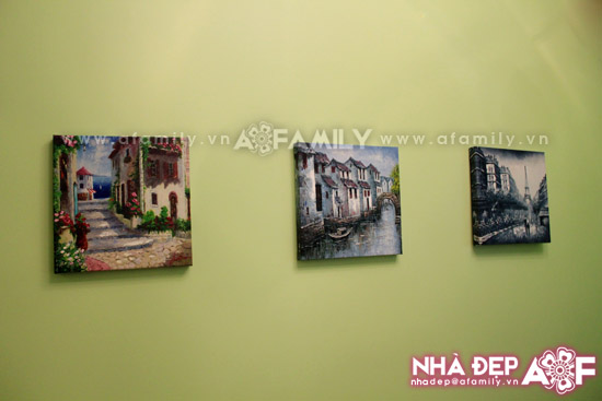 Trước đây chồng tôi có đi du học ở Đức nên có dịp thăm thú các nước trong khu vực, và bản thân tôi cũng thích những bức tranh có màu sắc nhẹ nhàng, nên ba bức tranh mang phong cách, vẻ đẹp cổ kính của châu Âu ở phòng khách khiến tôi rất tâm đắc.
