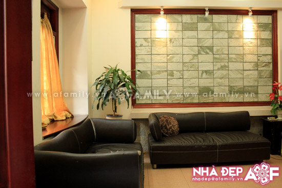 Với diện tích khá rộng, tôi được thả sức kiến tạo không gian trong nhà một cách thoải mái. Phòng khách được thiết kế rộng rãi và phối màu cổ điển. Khi bước vào nhà, khách khứa sẽ thấy ngay một bức tường ốp đá màu xanh xám tạo cảm giác dịu mát và ôn hòa. Với hệ thống đèn chiếu, cửa sổ đón ánh sáng, cùng với cách phối hợp màu sắc, căn phòng mang dấu ấn hiện đại nhưng cũng không kém phần sang trọng.