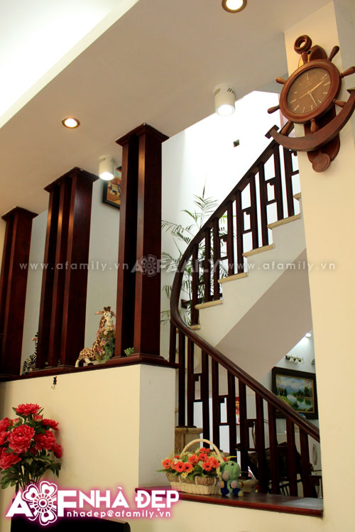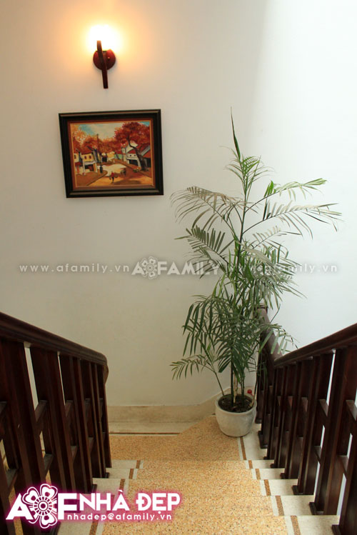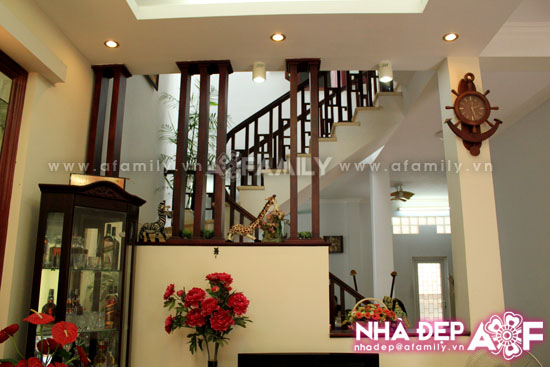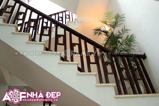 Cầu thang lên xuống cũng được phối màu nâu đỏ phù hợp với phong cách của không gian trong nhà. Đi theo mạch ý tưởng thiết kế của mình, trong phòng ăn, tôi đặt bộ bàn gỗ mặt kính và ghế bọc da tối màu để toát lên sự sang trọng và giữ cảm giác sạch sẽ.