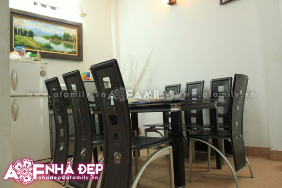 Đi theo mạch ý tưởng thiết kế của mình, trong phòng ăn, tôi đặt bộ bàn gỗ mặt kính