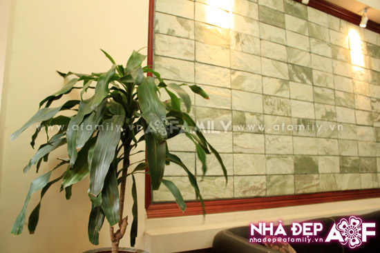 Bức tường ốp đá màu xanh xám tạo cảm giác dịu mát và ôn hòa.