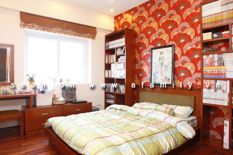 Phòng ngủ của Trang, nơi thể hiện cá tính và sở thích riêng của cô: những họa tiết trên giấy dán tường, bức tranh cô gái Nhật và 2 "kho báu" ăm ắp truyện tranh, trong đó có không ít những cuốn truyện tranh Nhật Bản.