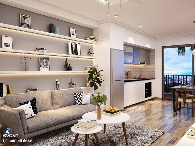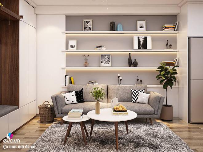 Ở phòng khách, điểm tường xấu xí đã được sử dụng giải pháp là kệ trang trí.