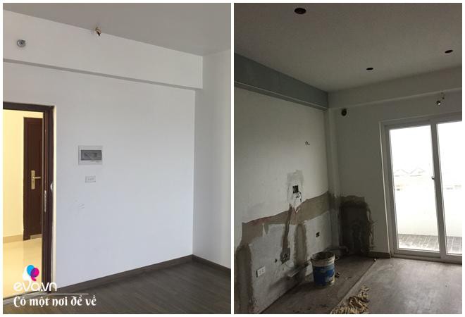 Chất lượng hoàn thiện của chung cư nhà anh Thịnh được KTS đánh giá không tốt vì trần khá thấp, cửa chính thấp, các diện tường xây không thẳng và dầm cột lộ ra rất mất thẩm mỹ đã được khoác nên màu áo mới.