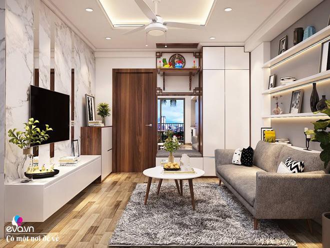 Cũng theo anh Thịnh và KTS cho biết, khu vực khó nhất để đưa ra giải pháp đó chính là mảng tường với nhiều dầm cột lộ ra mất thẩm mỹ ở phòng khách. Chính vì vậy, để có thể che điểm xấu xí này, cả 2 đã đồng ý sử dụng kệ trang trí. Mặc dù điều này làm khoảng cách giữa sofa và tivi hẹp lại một chút nhưng nó đã giải quyết tối ưu cho vấn đề khiến cả 2 đau đầu, gặp khó khăn.