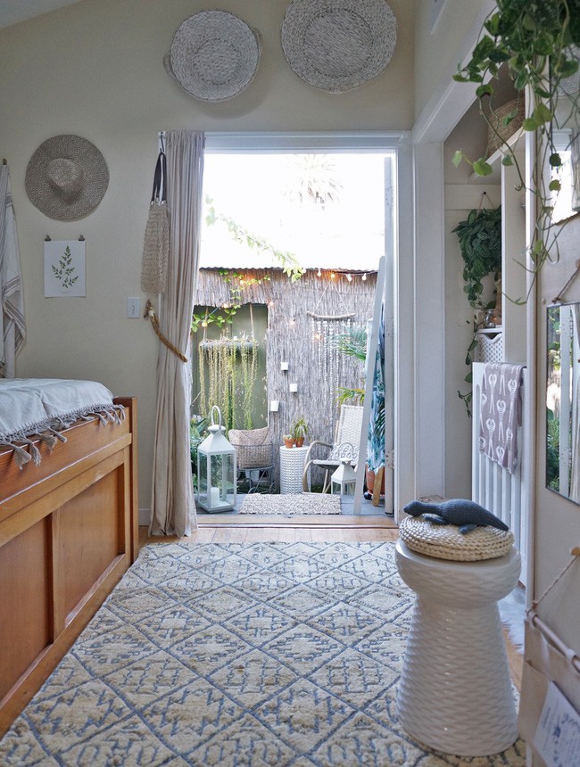 Chất cottage ấm cúng và sự tiện nghi, hiện đại được cặp đôi kết hợp khá hoàn hảo. Không khó để nhận ra những ngăn chứa ẩn tích hợp dưới gầm hệ sofa, gầm giường được đặt đóng riêng. Thậm chí bàn nước cũng là một chiếc rương mây có khả năng lưu trữ khủng.